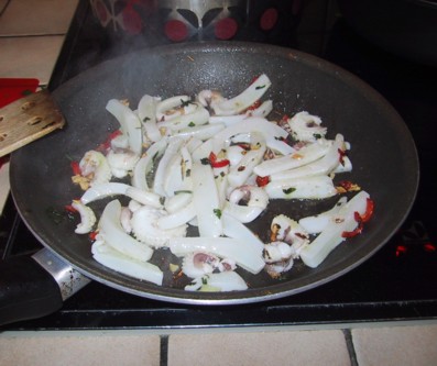 Dann die leicht gesalzene Sepia im Olivenöl sehr kurz und scharf anbraten