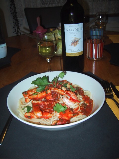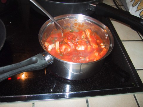 Die Sepia Streifen in die Spaghetti Sauce geben und 10 min lang bei niedriger Flamme mitkochen
